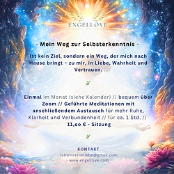 Der Weg zur Selbsterkenntnis ist eine persönliche Reise, die dich tief in dein Inneres führt. Manchmal herausfordernd, doch immer voller Schönheit, Erkenntnisse und Wachstum. Unser Angebot schafft für dich einen sicheren Raum, in dem du dir selbst begegnen kannst – ganz in deinem eigenen Tempo und ohne Druck. Unsere geführten Meditationen sind sanfte Begleiter auf deiner Reise. Sie öffnen dir den Raum für persönliche Einsichten, innere Ruhe und neue Perspektiven. Nach der Meditation hast du die Möglichkeit, deine Erfahrungen mit anderen zu teilen. Der Austausch mit Gleichgesinnten bereichert deine Sichtweisen, unterstützt dich auf deinem Weg und fördert gegenseitiges Verständnis. ➡️ Wie du von den Abenden profitierst: ⬅️ ✨ REGELMÄßIGE AUSZEITEN FÜR DICH SELBST: - Schaffe wertvolle Momente der Entspannung und Selbstreflexion in deinem Alltag. ✨ STRESSABBAU & INNERE BALLANCE: - Die Meditationen helfen dir, den Kopf frei zu bekommen und emotionale Klarheit zu gewinnen. ✨ TIEFE SELBSTWAHRNEHMUNG: - Durch das Nachdenken über deine Erlebnisse kannst du deine Gefühle besser verstehen und in dein Leben integrieren. ✨ PERSÖNLICHES WACHSTUM: - Entwickle ein tieferes Verständnis für dich selbst, stärke dein Selbstbewusstsein und fördere deine emotionale Gesundheit. Diese Praxis bietet dir die Chance, regelmäßig in Kontakt mit deinem Inneren zu treten, dich selbst besser kennenzulernen und deine persönliche Entwicklung aktiv zu fördern. ➡️ WICHTIG! Den Link zu deiner Zoom Sitzung, erhält du nach dem Kauf per E-Mail. Bitte beachte: - Die Meditationsabende finden jeden Sonntag statt. Ich freue mich darauf, dich an diesem Tag begrüßen zu können! Liebe Grüße Karina Kontaktiere mich gerne bei Fragen oder Unklarheiten: Tel: 0176 70388729 Mail: ichbinreineliebe@gmail.com ➡️ ✨EXKLUSIVE ANGEBOTE FÜR DICH ⬅️ ➡️ www.engellove.com ⬅️ ✨ PERSÖNLICHE BEGLEITUNG: Buche eine individuelle Meditationsbegleitung oder Coaching-Sitzung, um gezielt an deinen persönlichen Themen zu arbeiten. ✨ EXKLUSIVE KURSE : Unsere Kurse begleiten dich auf deiner tiefgehenden Reise zu deinem inneren Selbst, um dir dabei zu helfen, dich bewusster wahrzunehmen, innere Blockaden zu lösen und dadurch mehr Harmonie, Klarheit und eine gesteigerte Lebensqualität in deinem Alltag zu erleben.